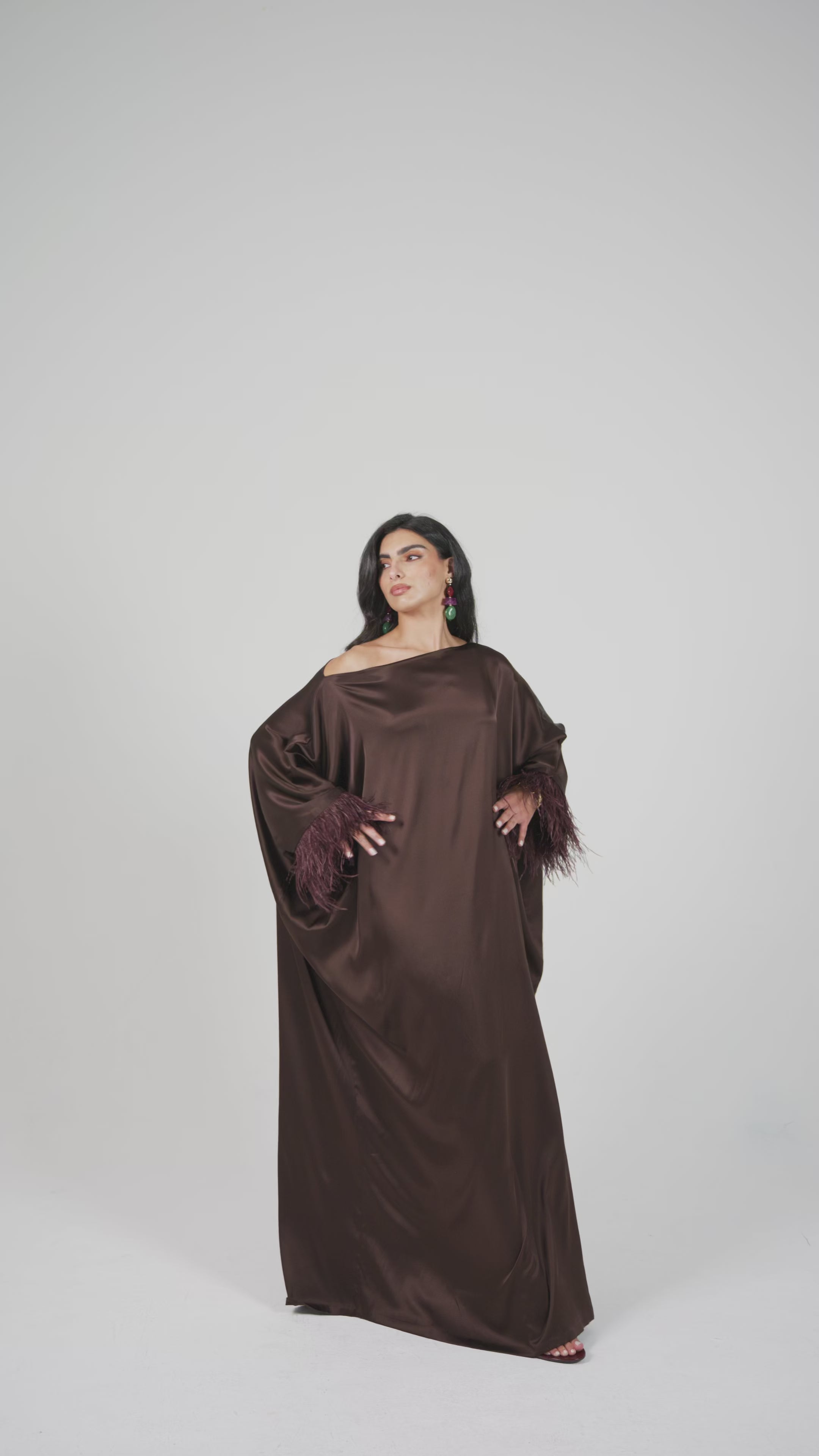 The Chocolate dress by SOLA is a decadent display of rich color and texture, featuring a deep burgundy satin that exudes a warm burgundy glow. The fluid drape of the satin is beautifully contrasted by a trim of plush feathers, adding a layer of playful movement and high-fashion drama. It is a striking choice for those who want to combine a classic, romantic palette with a bold, tactile statement.